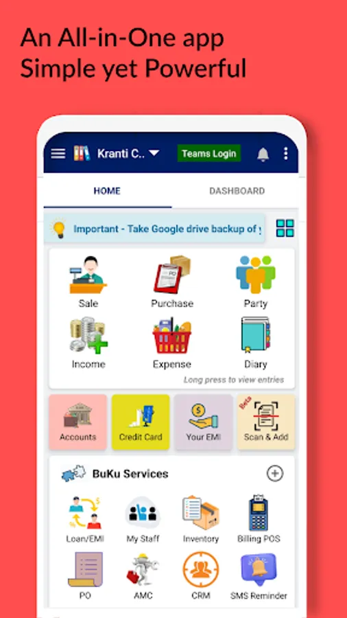 BuKu can be used as simple invoice maker, money manager & digital business intelligence app to maintain income, expense, bills, party ledger/khata, sale, purchase, employee advance/salary, inventory, invoice, quotation, CRM, Loan EMI calculator, Payroll, Daily Sales Record, invoice generator, hrms