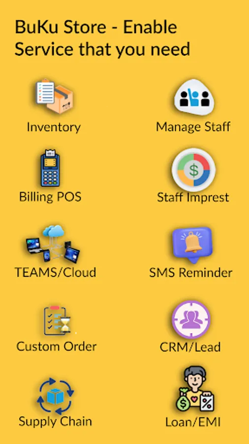 Buku provides optional services like Reminder system, School, Supply Chain logistics, Loan/EMI, Project, Manufacturing, Assembly line, Donation, AMC management.