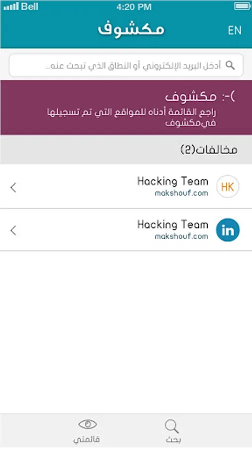 Makshouf alerts users if their account/email address has been listed in sources that have already been compromised. In a world run by technology, a cyber-attack is just as dangerous as a physical one, and can happen anytime, anywhere – Makshouf helps you stay alert.