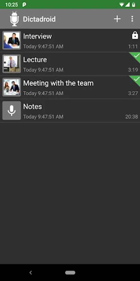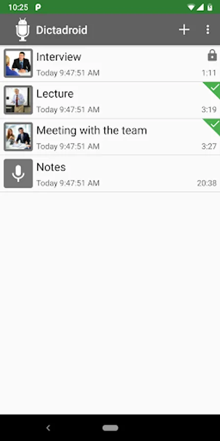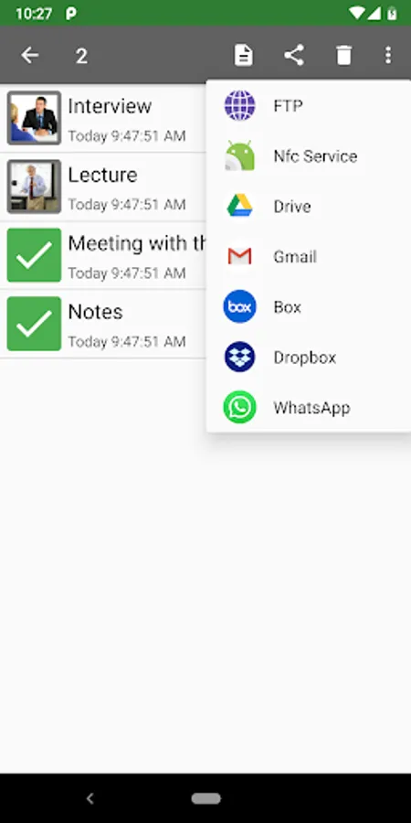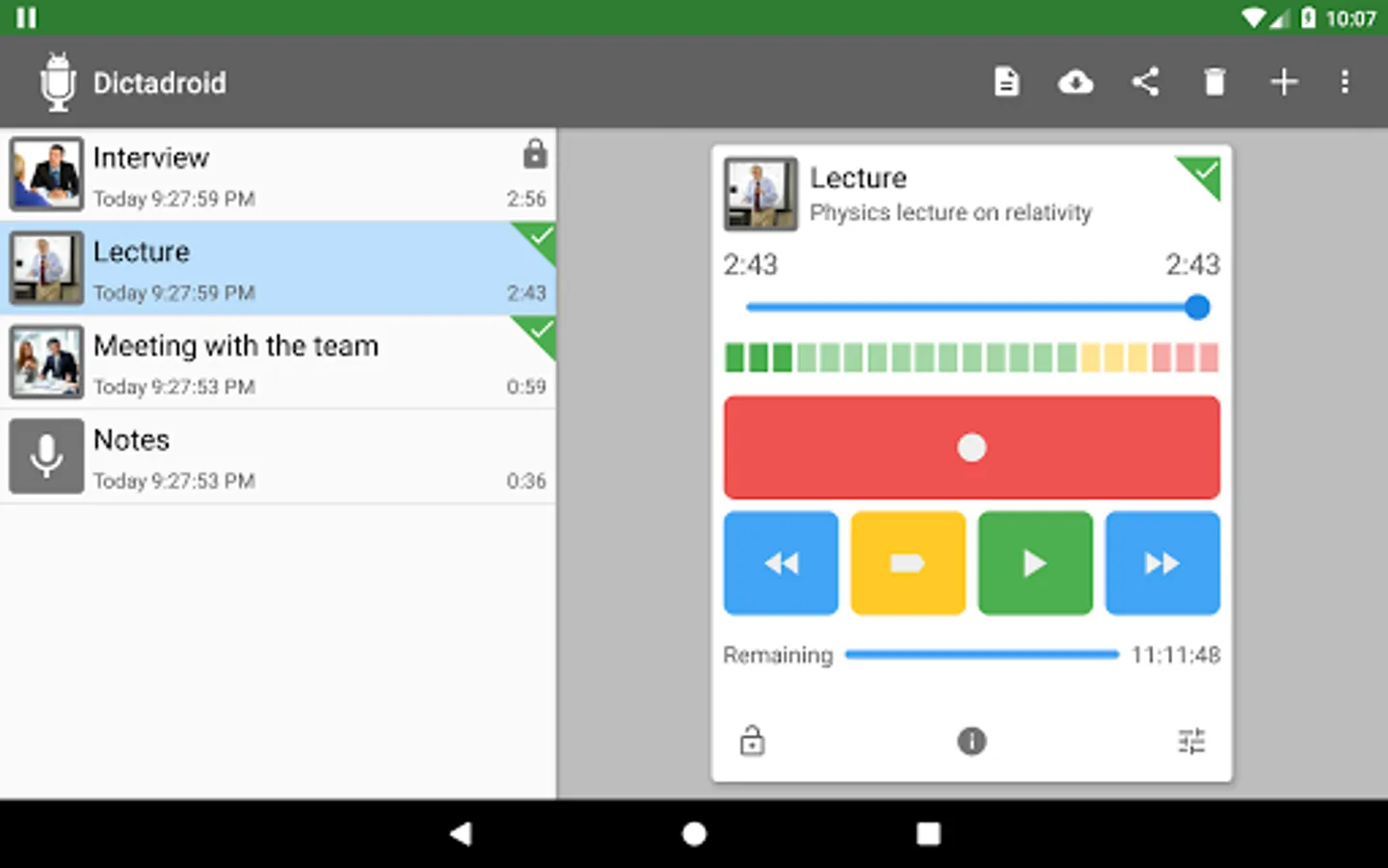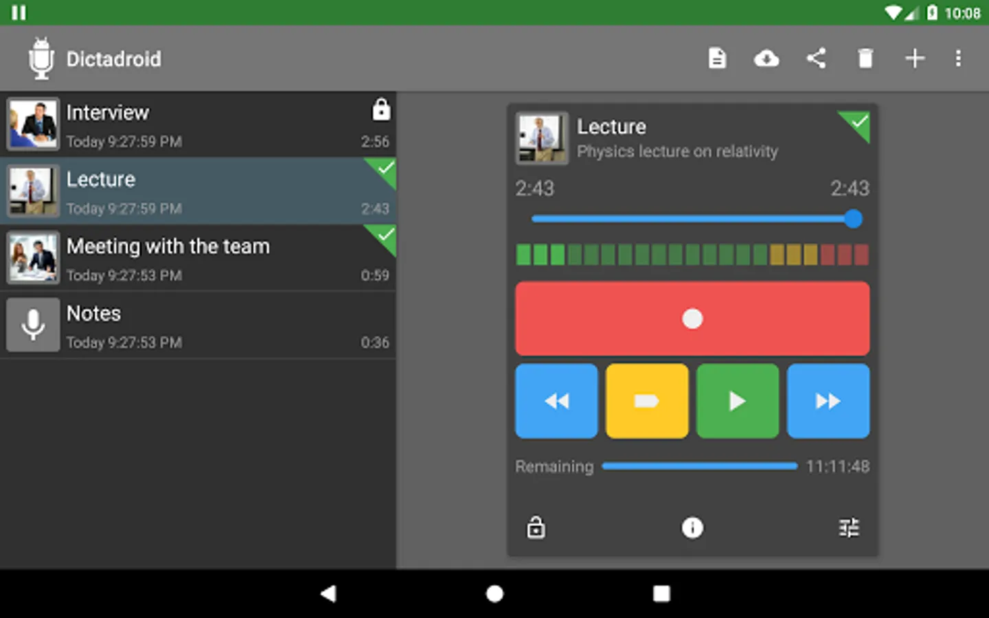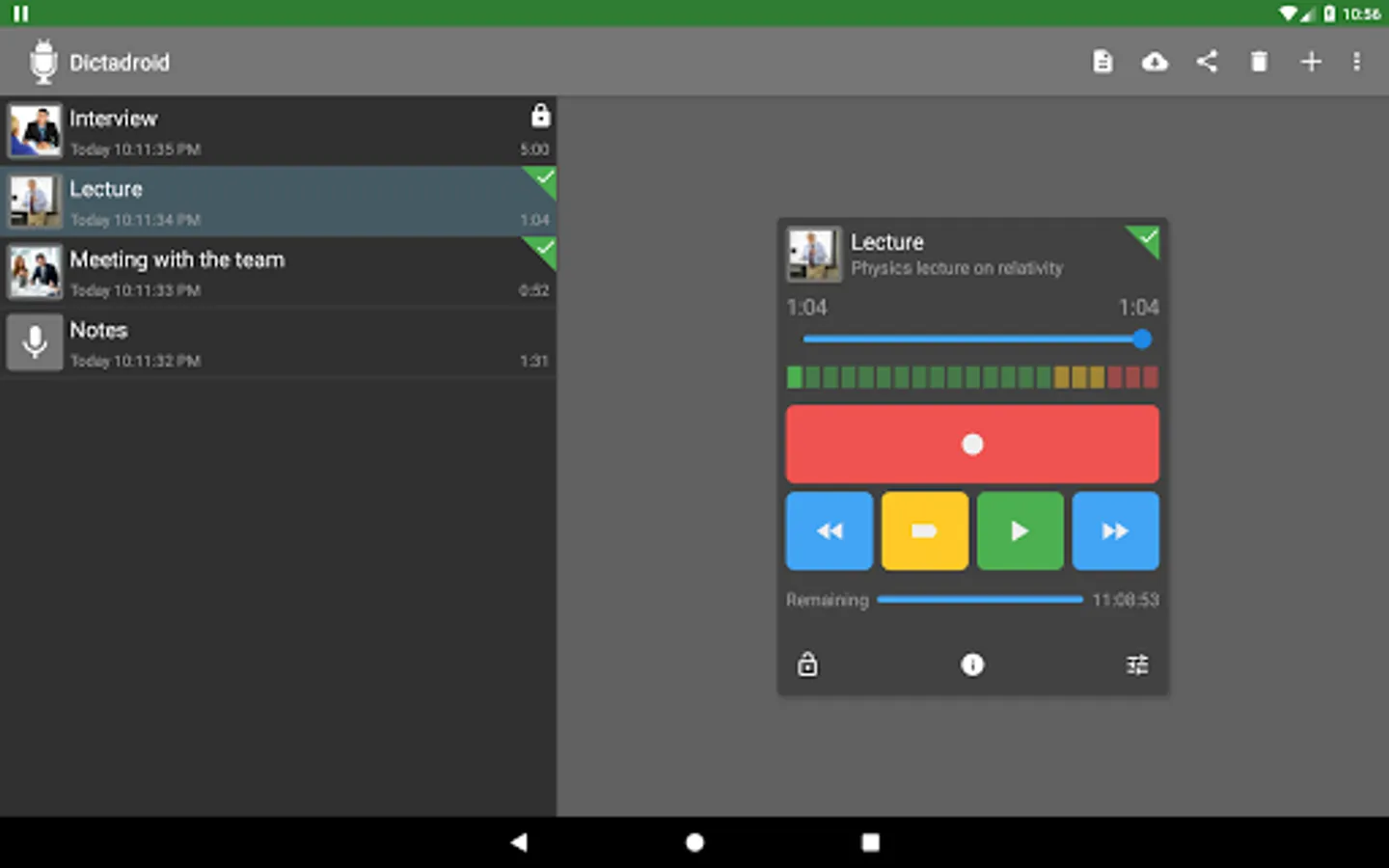 Dictadroid turns your Android phone or tablet into a professional, high-quality dictation machine and voice recorder. Use it to record voice dictations, notes, meetings, music, or any other audio and share it via Email, FTP, Box, Google Drive, or Dropbox.