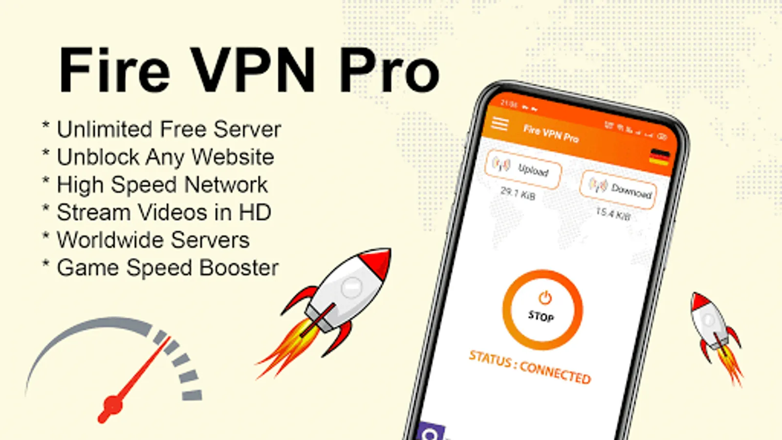 Fire VPN Pro 2022 is a lightning-fast app that provides a free VPN proxy service. Not need any configuration, just simply click on the Start button, you can access the Internet securely and anonymously with High Speed VPN Server.