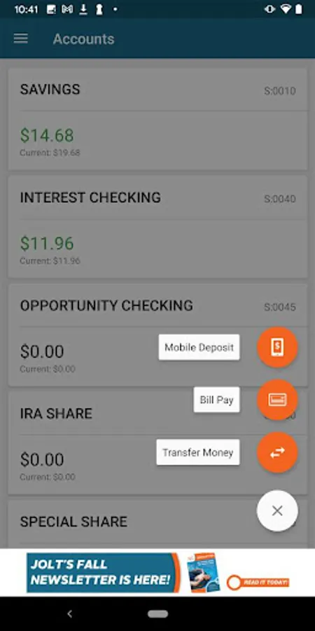 Jolt Mobile Banking allows you to check balances, transfer funds, make loan payments, view transaction history, pay bills, and deposit checks on the go!