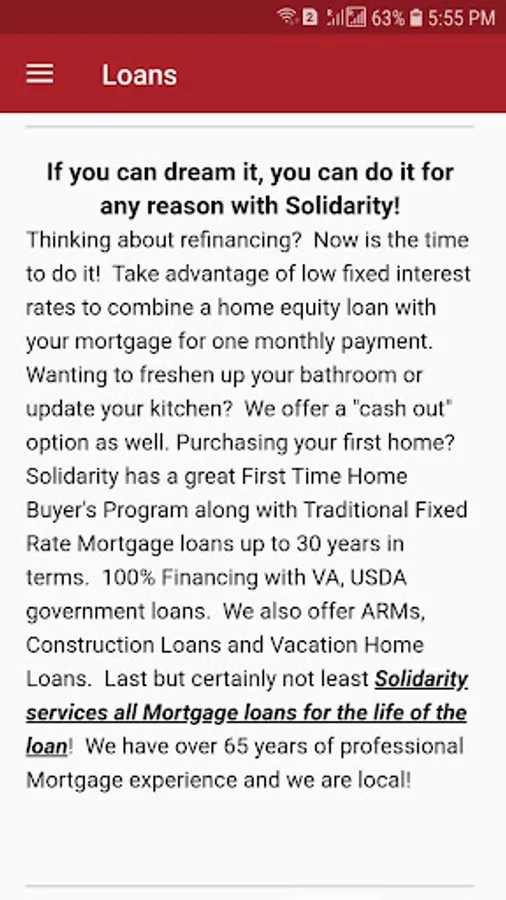 Solidarity's Mobile Banking App allows you to check balances, make check deposits, view transaction history, transfer funds, pay bills, apply for a loan and more on the go!