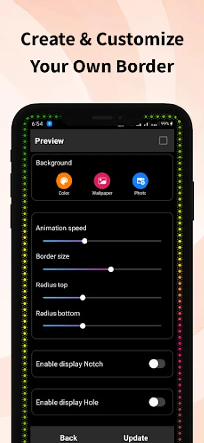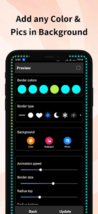 You can easily use Settings available in the application to customize the Phone Screen Border EDGE lighting as per your choice which includes changing the colours, adjusting the width, type of EDGE lighting border, display notch settings, HD wallpapers and Magical Edge Lighting for your Phone Border Light Wallpaper.
