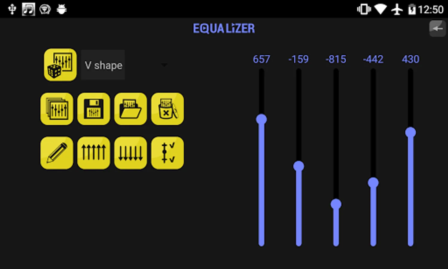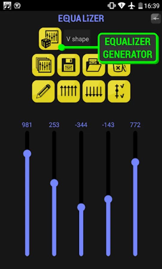 The equalizer screen contains a generator that allows you to select a shape among several and generate random equalizer settings with that shape.
