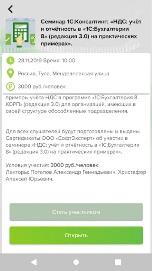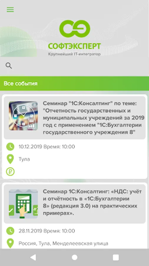 Application for registration for the events of GC SoftExpert. Stay up to date with events organized by Tula's largest IT integrator. Browse programs and speaker lists. Sign up for seminars and conferences online, pay for workshops and lectures, receive push notifications with event reminders.