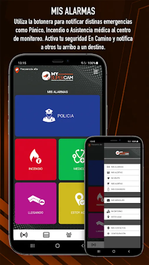 - Police, fire and medical panic buttons, sending geographic position, sound and images of your emergency (MY ALARMS)