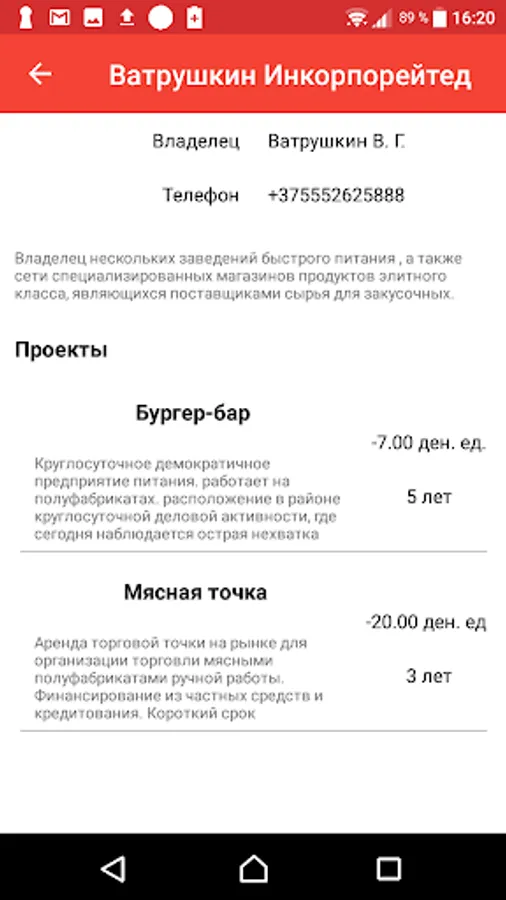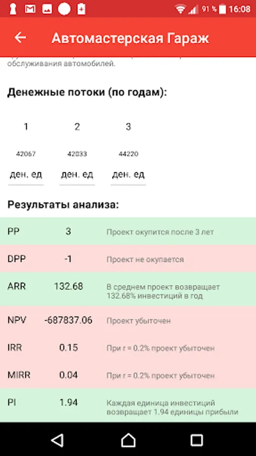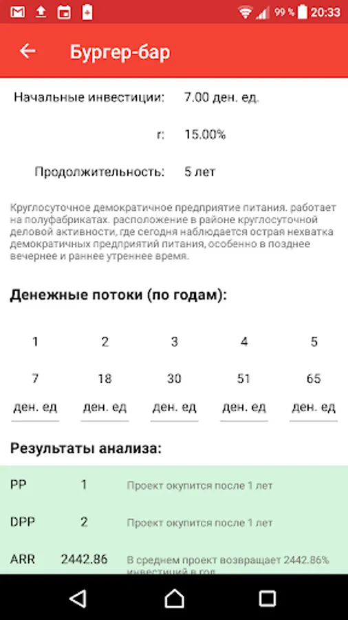 The application allows you to calculate such indicators of the investment attractiveness of the project. like NPV, IRR, DPP, PI and others. It is possible to group projects by companies and groups