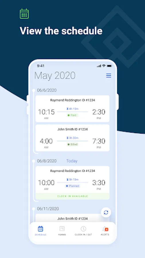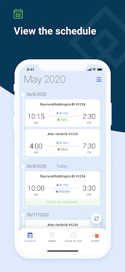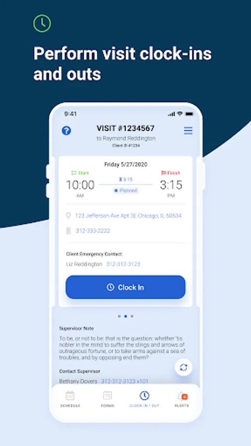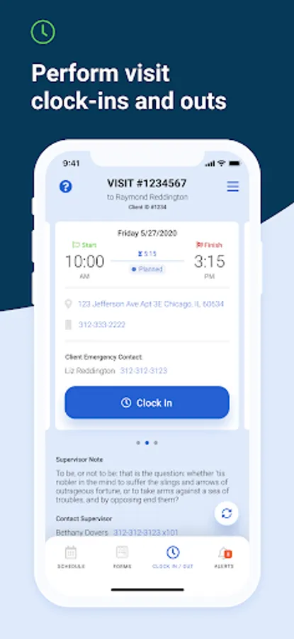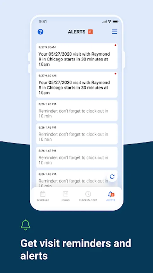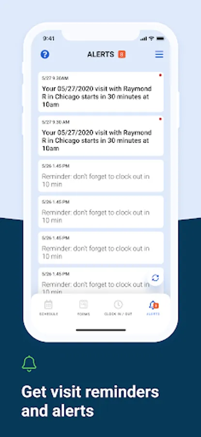The application allows Caregivers to view the schedule, get visit reminders and alerts, perform visit clock-ins and outs.