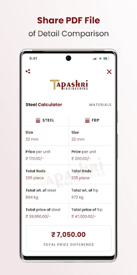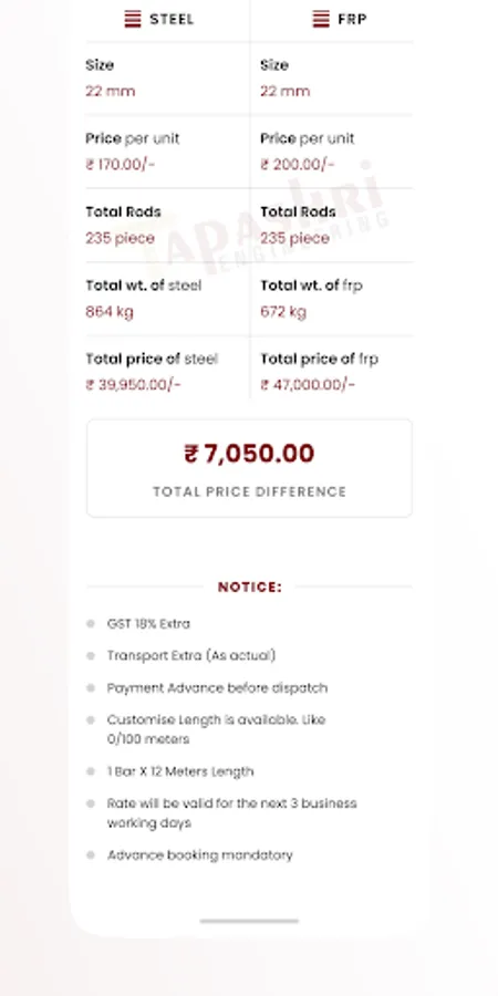 Tapashri App helps users to easily calculate and compare rates and price differences between Steel and FRP. App is easy to navigate for any user and can share comparison PDF with their respective clients.