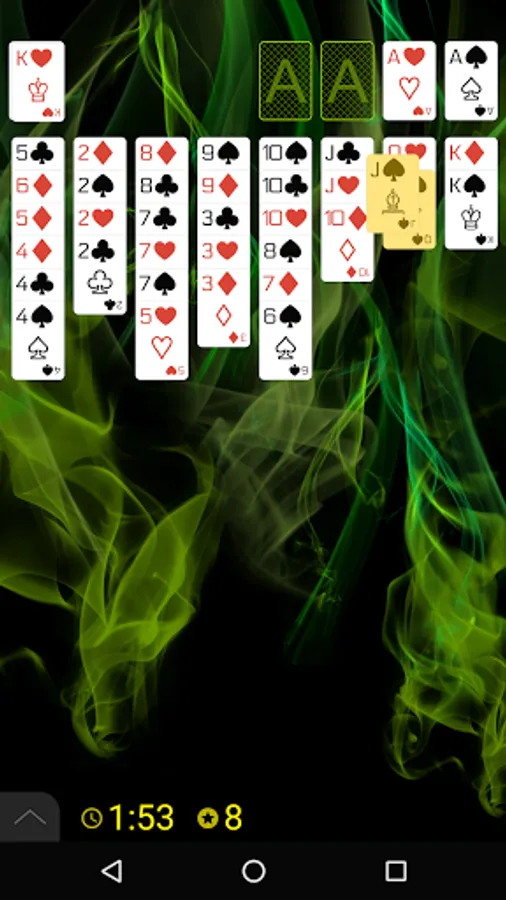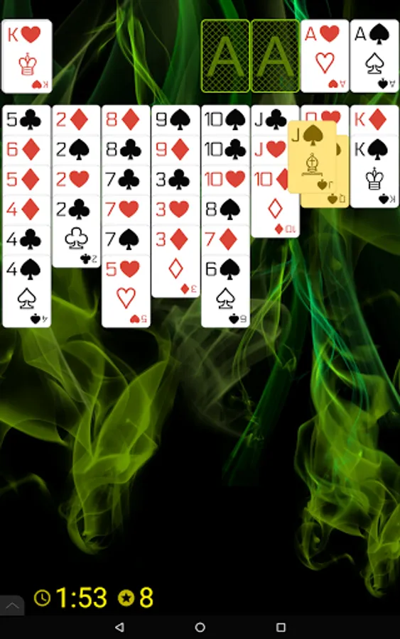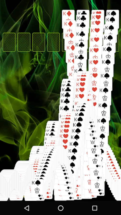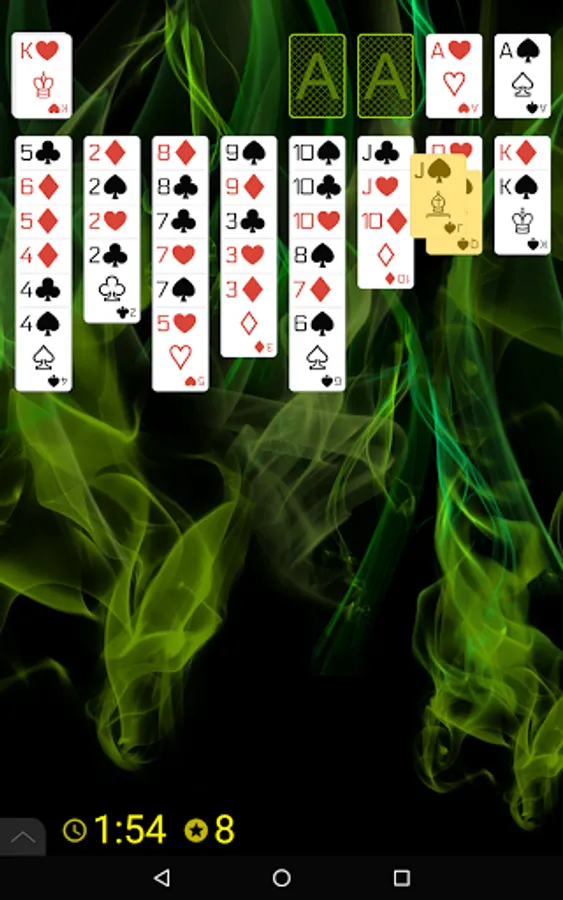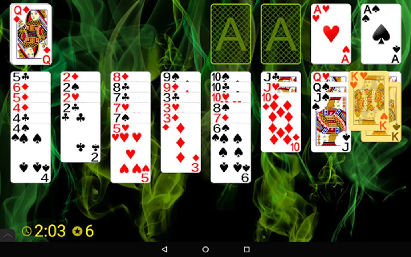 Use all the cards to complete the Foundations, build each one in suit from A to K. Move cards from the Stock to the Tableau. Any card may be played to any pile, but cannot be moved once placed. Only Ace can be moved to the Foundation until the Stock is empty. Once all cards are played, cards may be moved to the Foundations