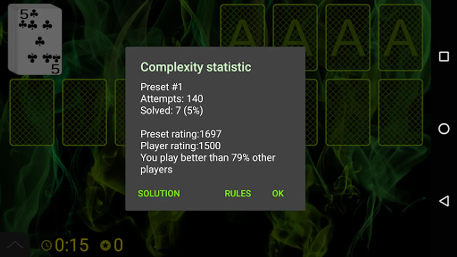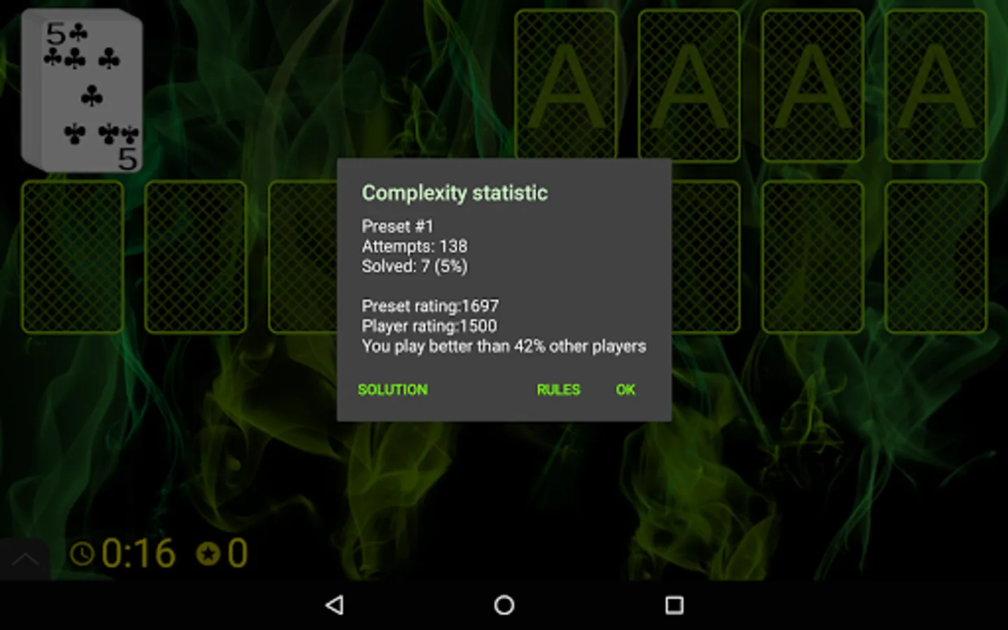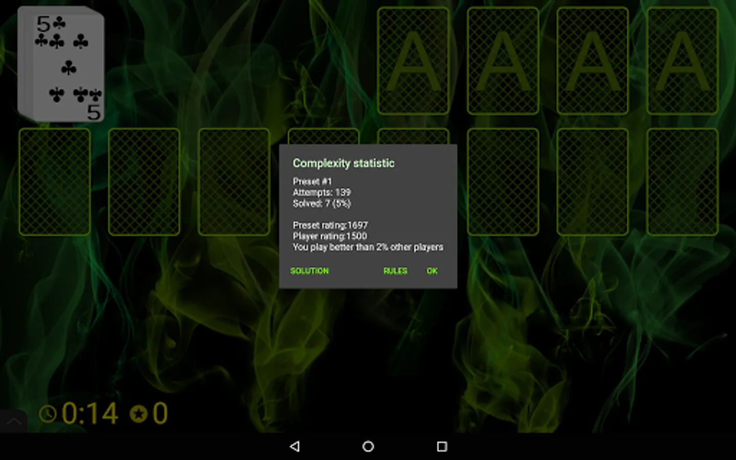 Use all the cards to complete the Foundations, build each one in suit from A to K. Move cards from the Stock to the Tableau. Any card may be played to any pile, but cannot be moved once placed. Only Ace can be moved to the Foundation until the Stock is empty. Once all cards are played, cards may be moved to the Foundations