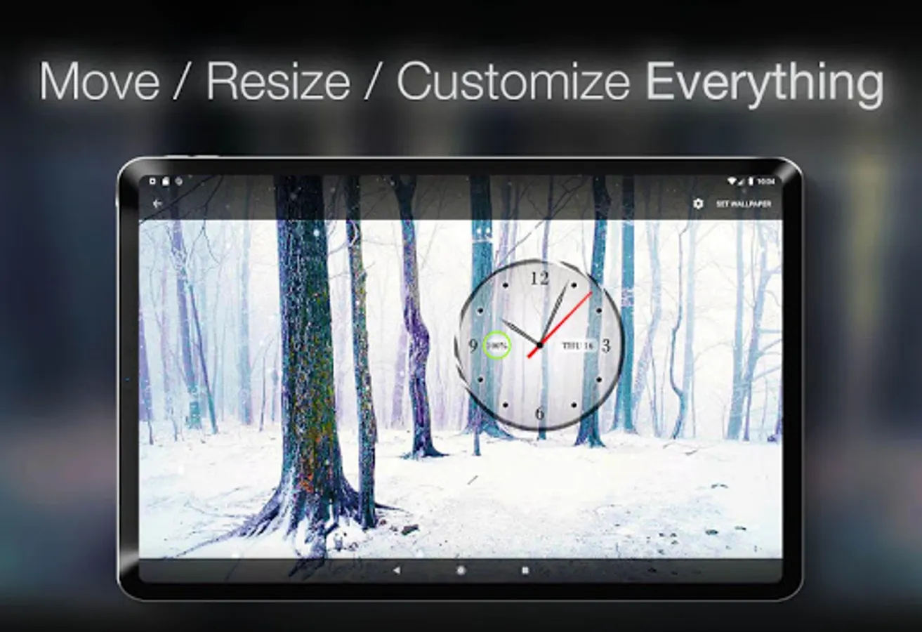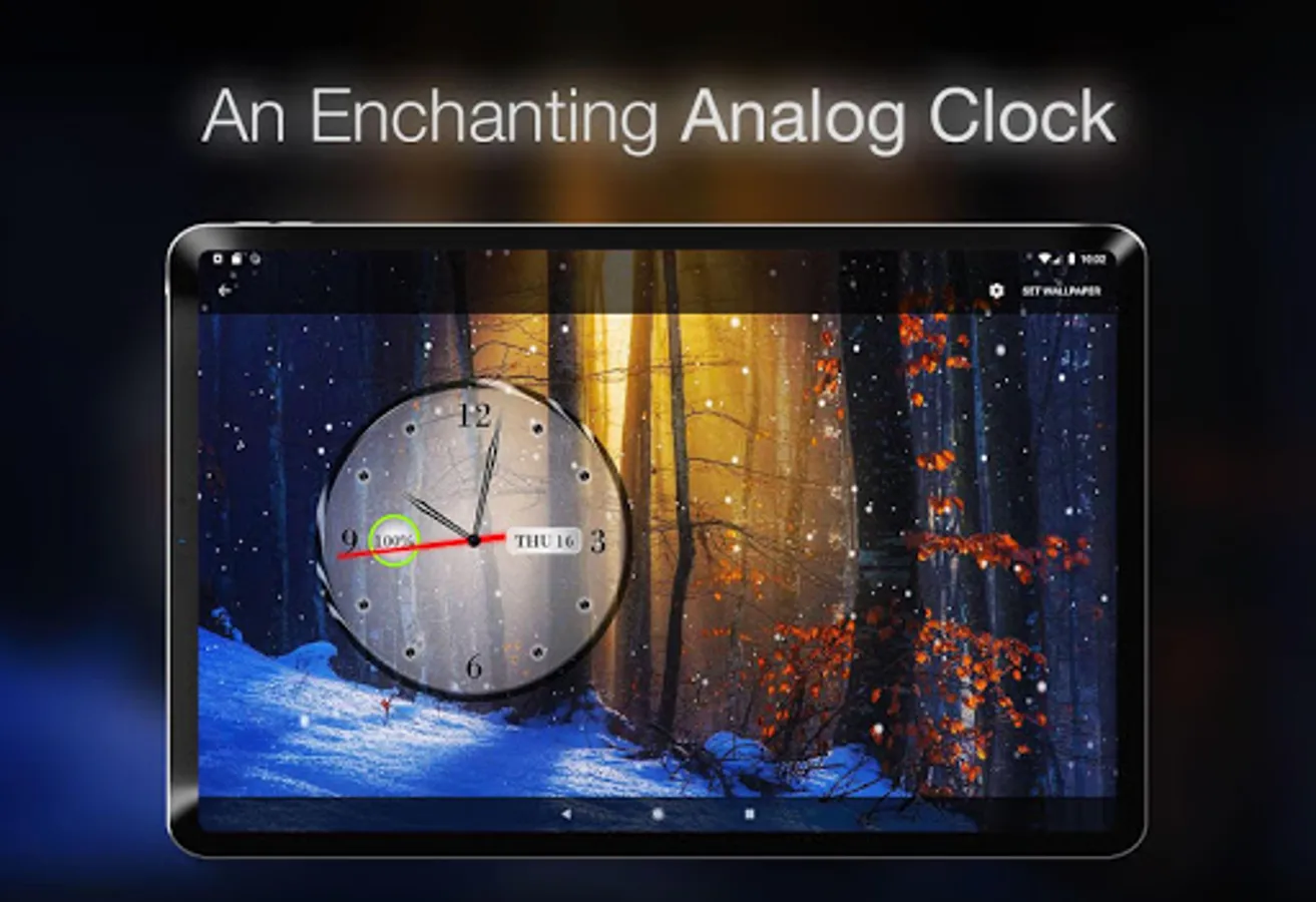 We have designed this analog clock in a unique way, by adding a battery percentile indicator, a calendar weekday indicator and to induce the sense of time passing, we added a gentle falling snow in the background. It creates a magical experience that you will immediately love.