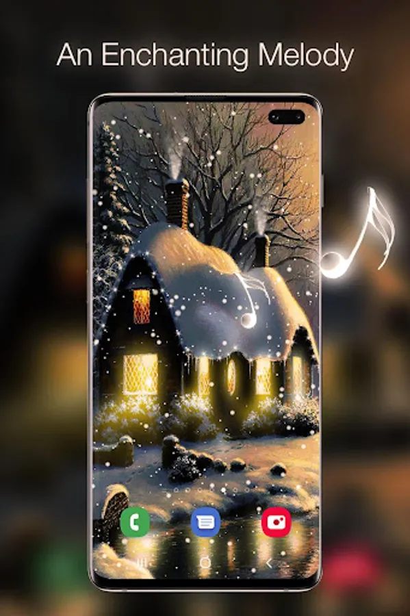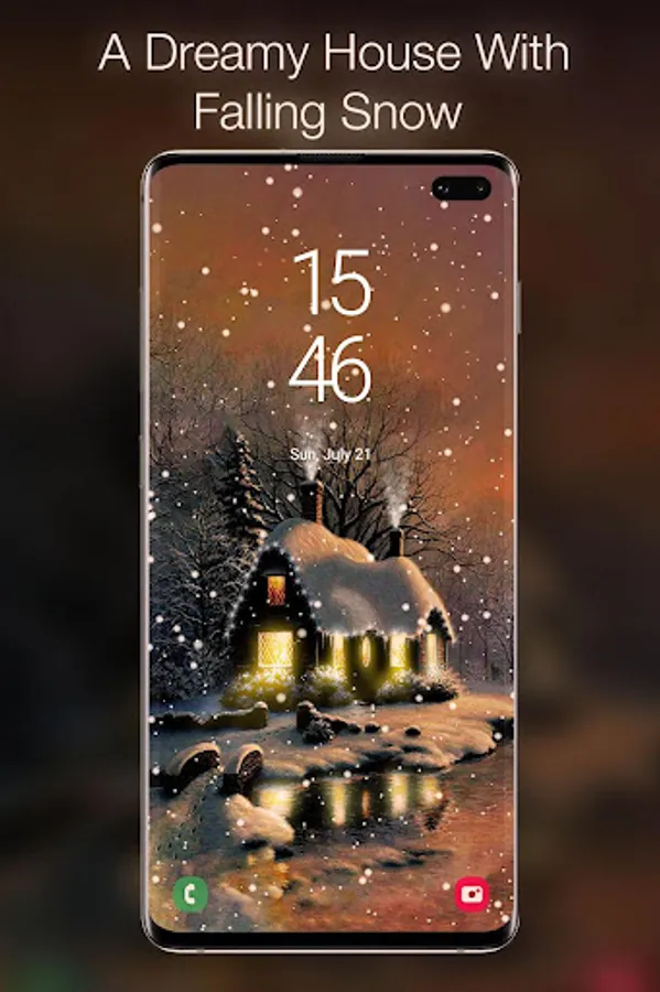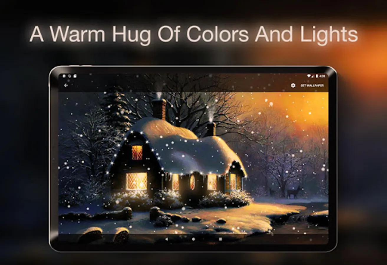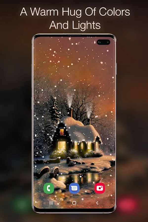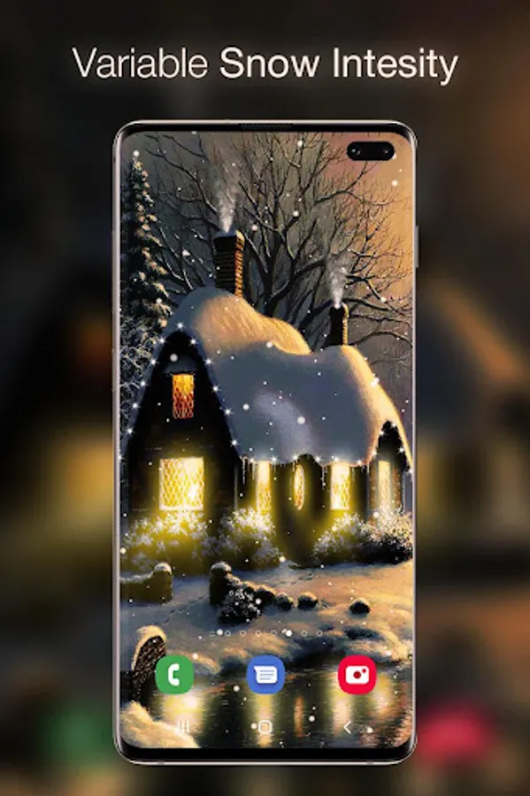 Snow Live Wallpaper is an artistic creation that aims to put you in the Christmas mood through a winter themed animation. The Live Wallpaper depict a dreamy house in a winter twilight while a gentle falling snow covers everything. The winter cottage has some gently variating windows lights and it is decorated with some rooftop flashing lights that emanate festivity and happiness. You can optionally turn on a Christmas music from the settings menu to completely immerse yourself into the Christmas spirit. You will love the nostalgic sensation that permeates your mind the first time you see the snowfall live wallpaper. The snowfall intensity, direction and speed can be changed from the settings menu. The live wallpaper comes with two different views of the cottage where one is closer the viewer and the other is more distant.