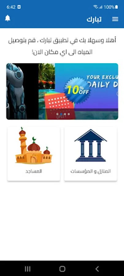 Tabarak is an application that specializes in purchasing and delivering water cartons to mosques in all cities of the Kingdom of Saudi Arabia with simple steps.
