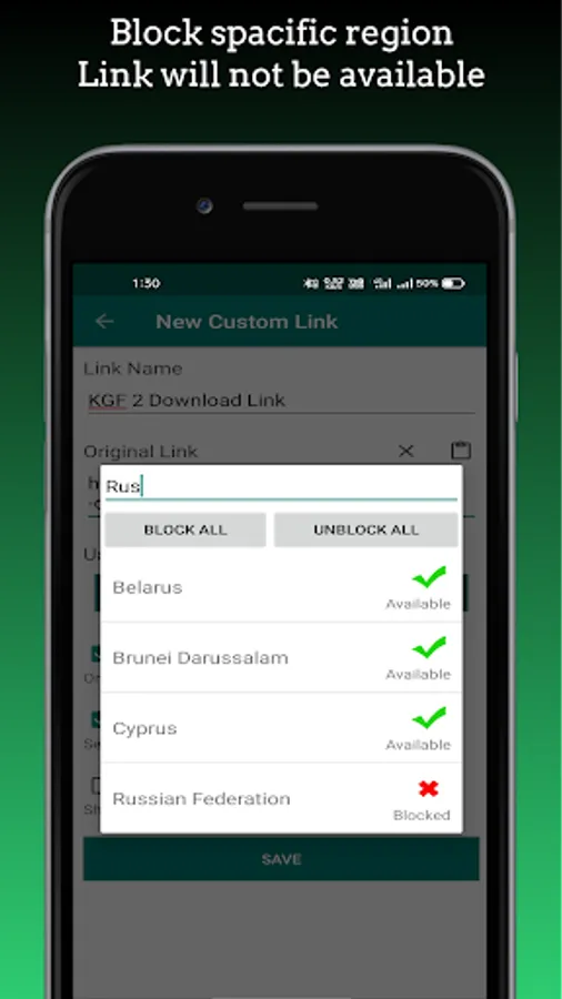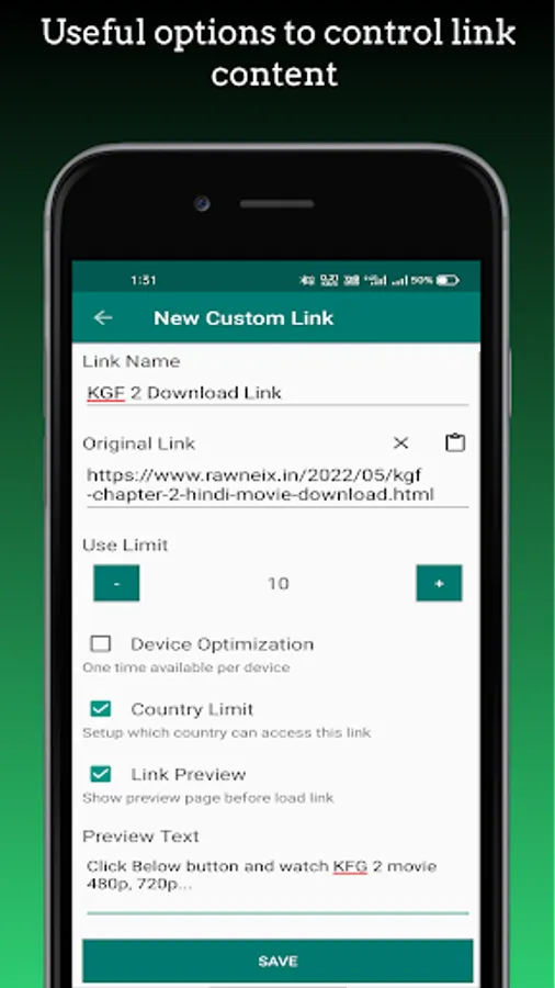 As the name custom links are custom usable. You can give any link(URL) and app this tool return you another link. This link just redirects original link but pass through conditions. You can set country wise availability and set use limit by number.