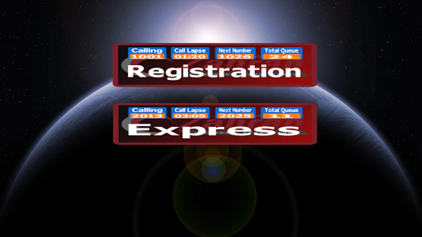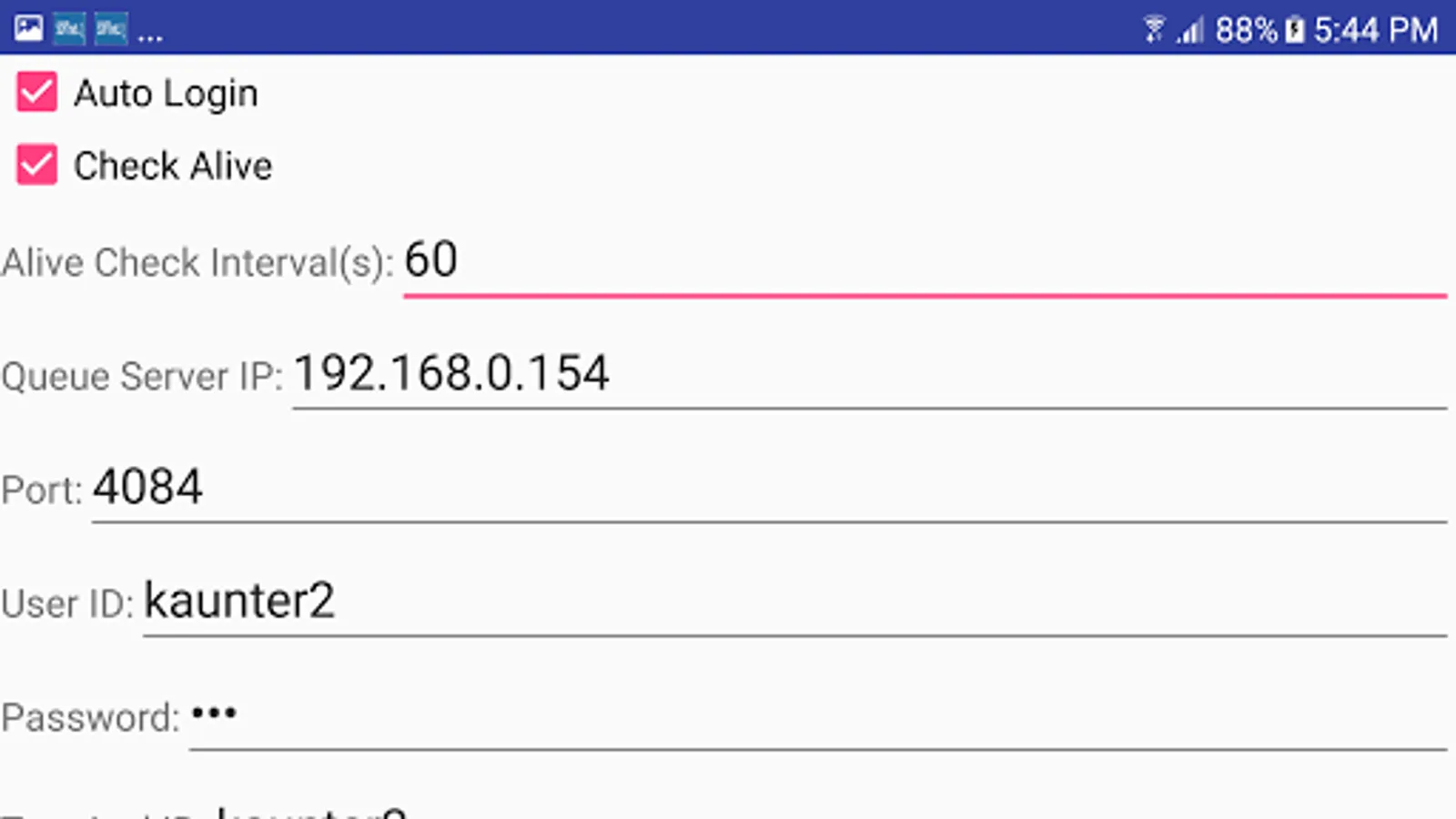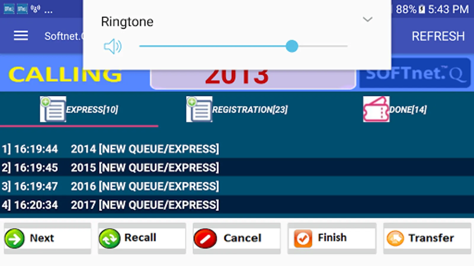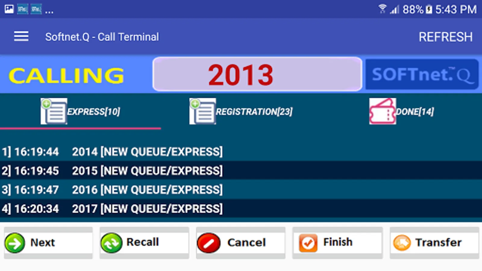 Android version of calling terminal and ticket selection interface for softnet queue management system. A calling counter can be configured to serve multiple services.