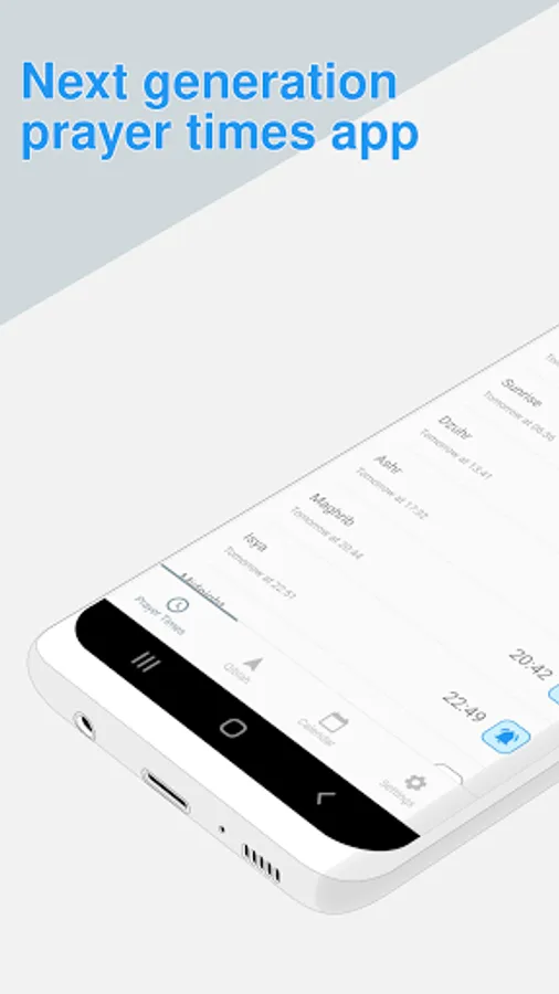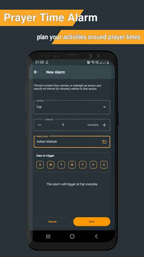 • Unlimited alarms with customizable interval relative to prayer times, alarm tones, and days to trigger.