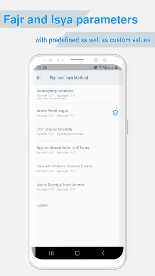 • Highly customizable parameters for Fajr and Isya (with predefined as well as custom values).