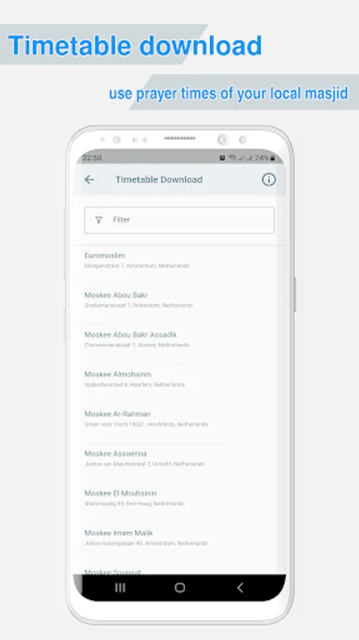 • Shows prayer times based on calculation or based on timetable of (local) Masjid.