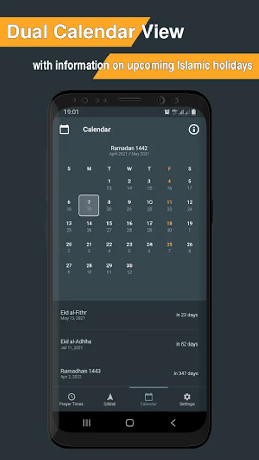• Hijri and Gregorian Calendar with information about upcoming Islamic feasts.