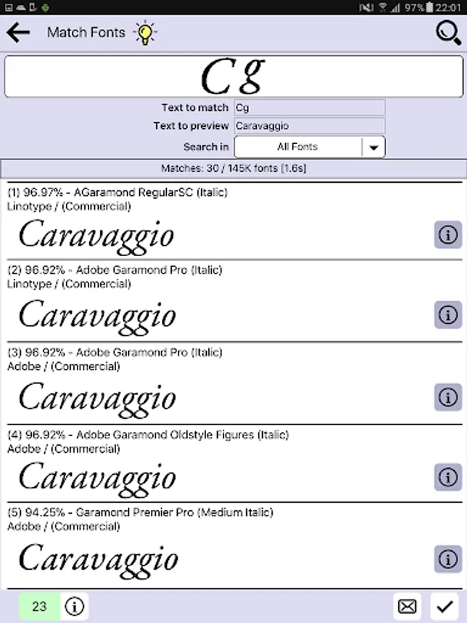 Use Find my Font to identify the fonts in any digital image in seconds! Take a photo or load a gallery image and let the app find any free or commercial fonts in the picture.