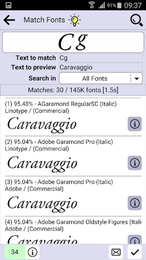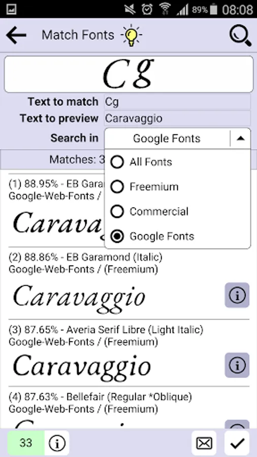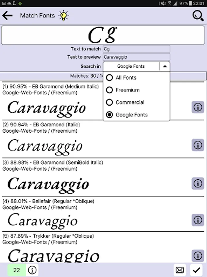* You can choose your preferred matching category: "All fonts", "Freemium"(*), "Commercial", "Google Web Fonts" (ideal to find any Google Fonts that look similar to a commercial font)