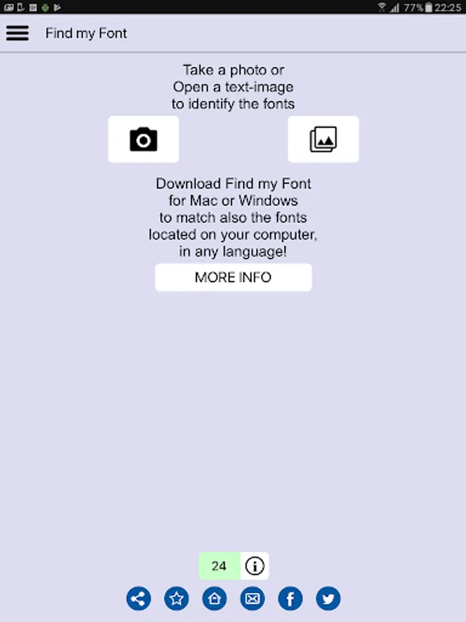 Note: Find my Font mobile, identifies only Latin letters & symbols. For non-Latin letters identification, you can download Find my Font Desktop for your Mac or Windows PC to identify both Latin fonts from our online database and/or any Unicode language fonts stored or installed in your computer (www.findmyfont.com)