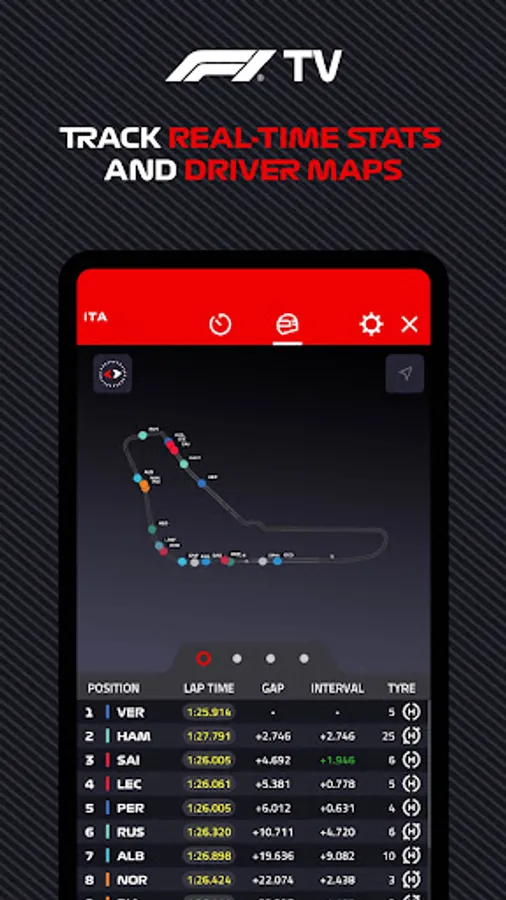 • Live telemetry data and session insights, including comprehensive tyre Information, lap times, speed and DRS.
