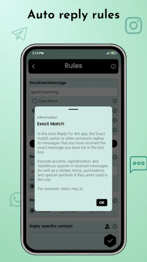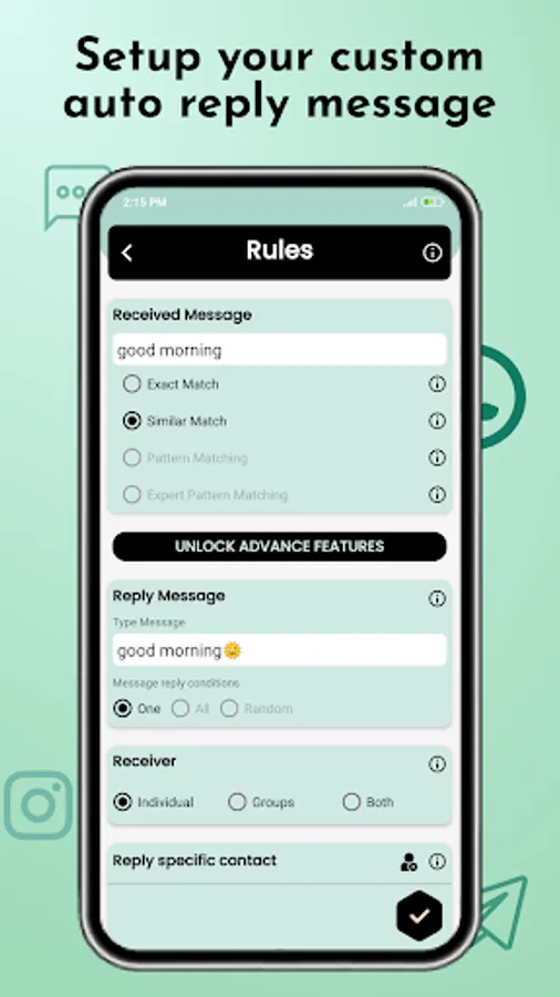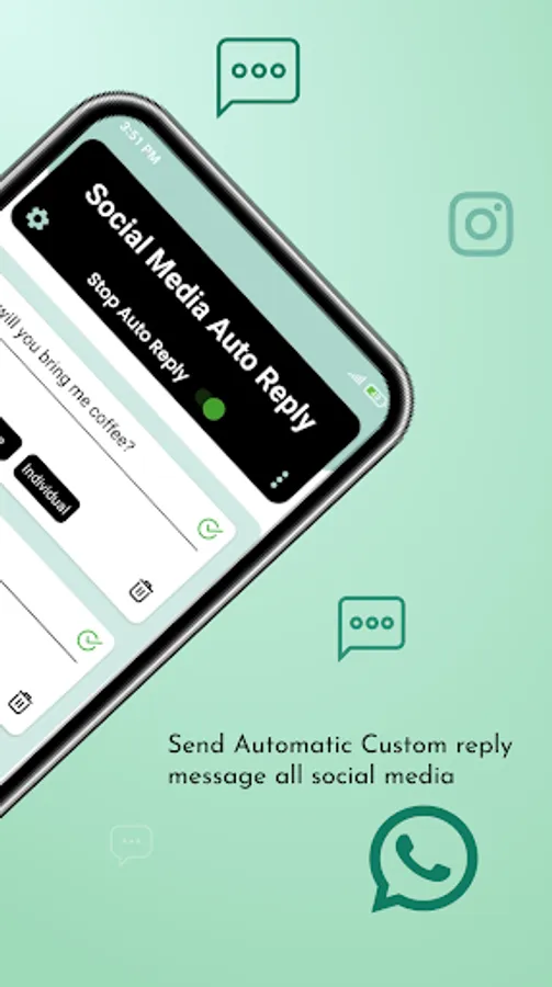 Try the Social Media Auto Reply Bot app to help with an automated reply to anyone contacting you. Social Media Auto Reply Bot for social media apps has incredible features like Welcome text, delay time, exact, similar & phrase match, and many more. Social Media Auto Reply Bot enables you to communicate more efficiently with your customers and save time.