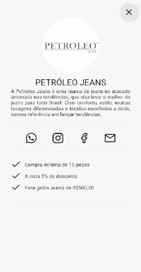 Petróleo Jeans is a wholesale jeans brand tuned to trends, which aims to bring the best of jeans to all of Brazil. With comfort, style, many different washes and handpicked fabrics, we are a reference in launching trends.