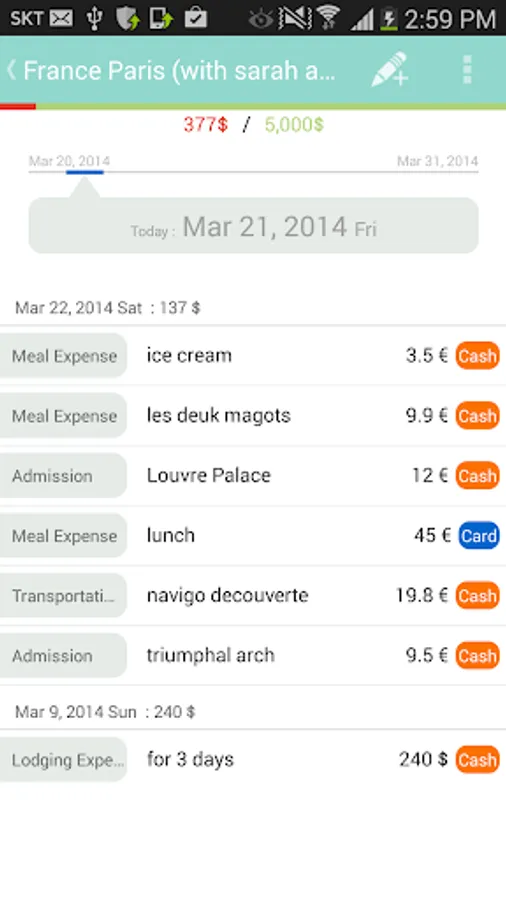 Create a personal ledger per travel: Budget setting, entry of various currencies, automatic/manual updating of exchange rates, etc.