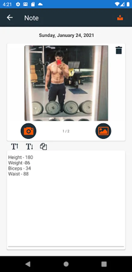 - Save important daily details (weights, height, waist, chest, biceps size, etc)