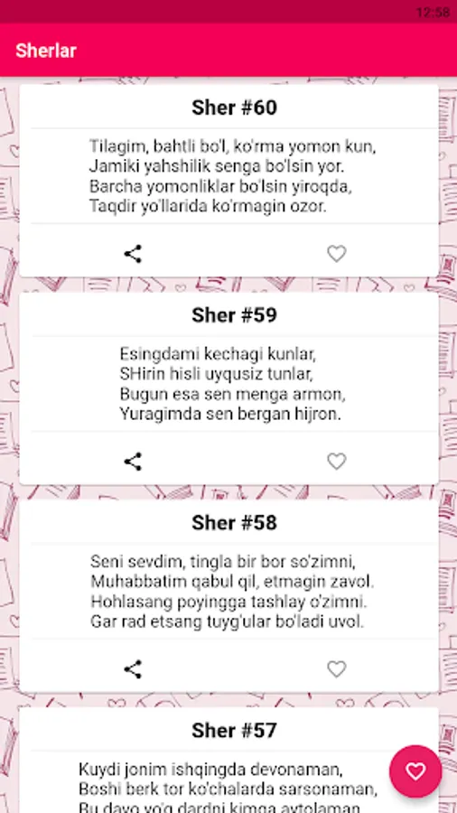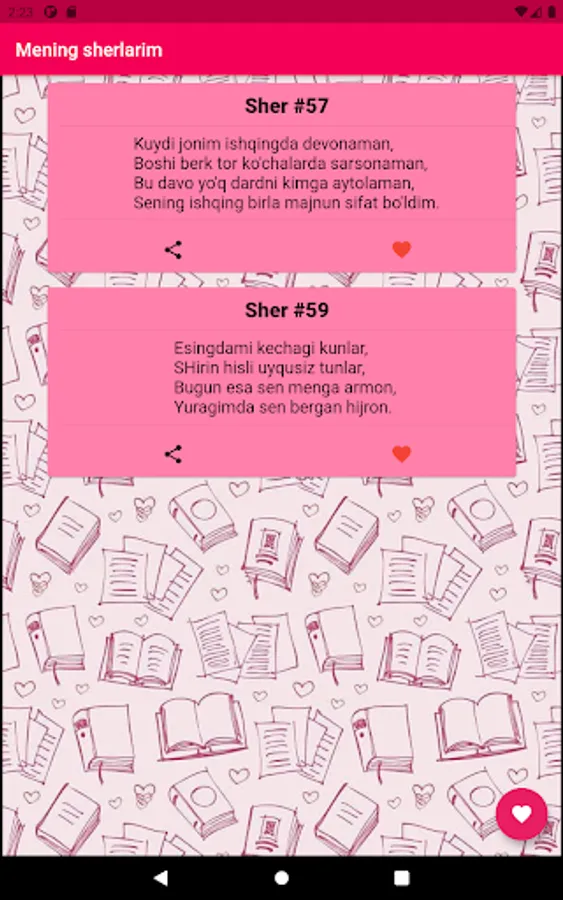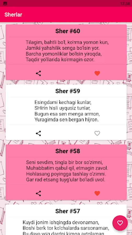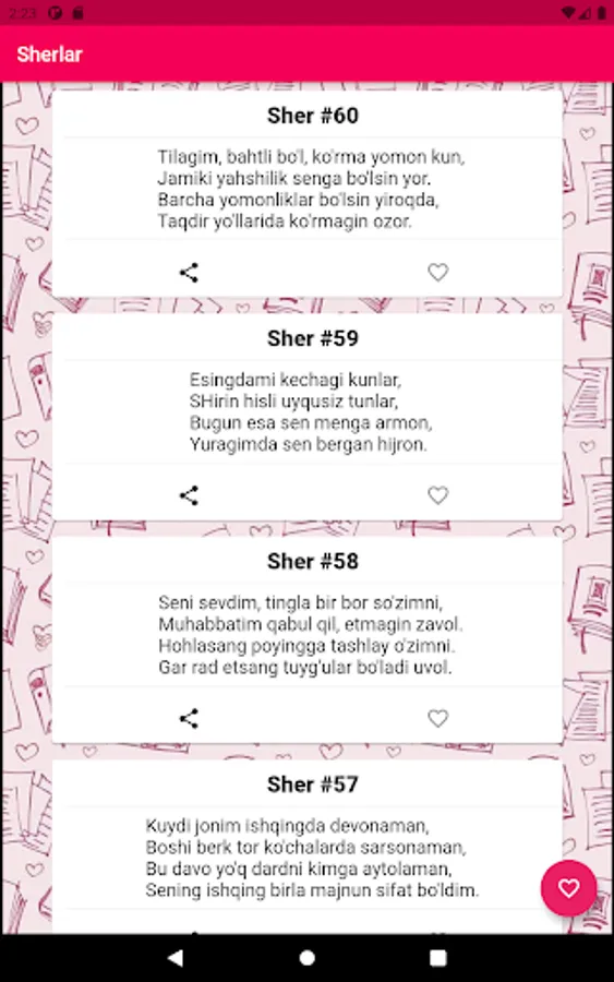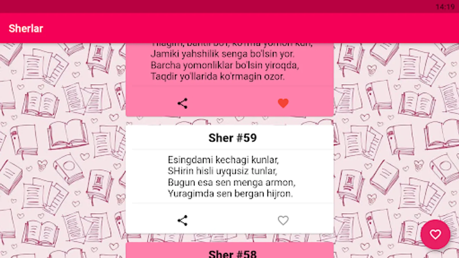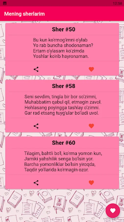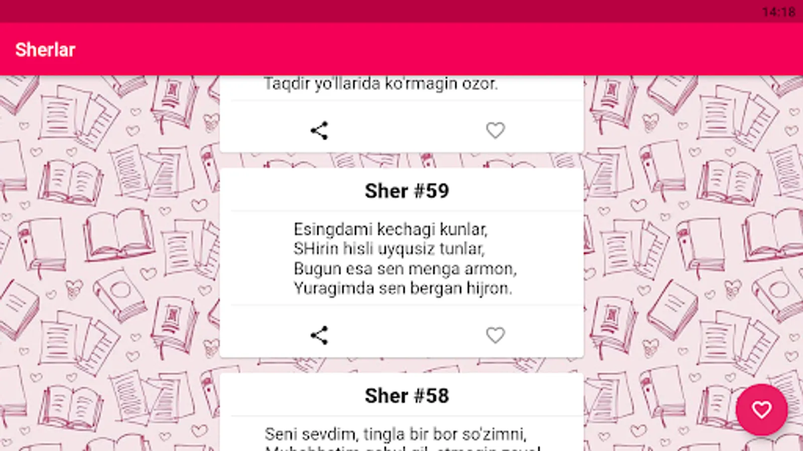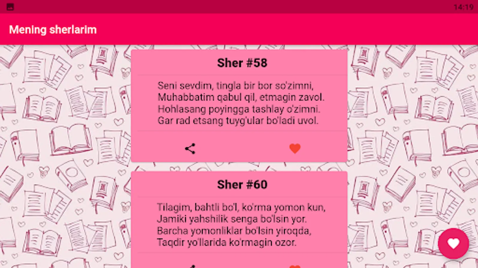 Sevgi sherlar ilovasi vaqti-vaqti bilan yangilanib turadigan ko'plab sevgi she'rlarini taqdim etadi va ularni "Mening tanlaganlarim" da saqlash, shuningdek, kontaktlaringizga yuborish imkonini beradi.