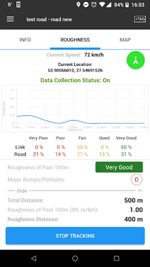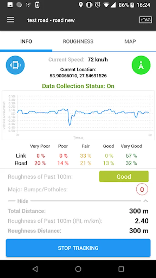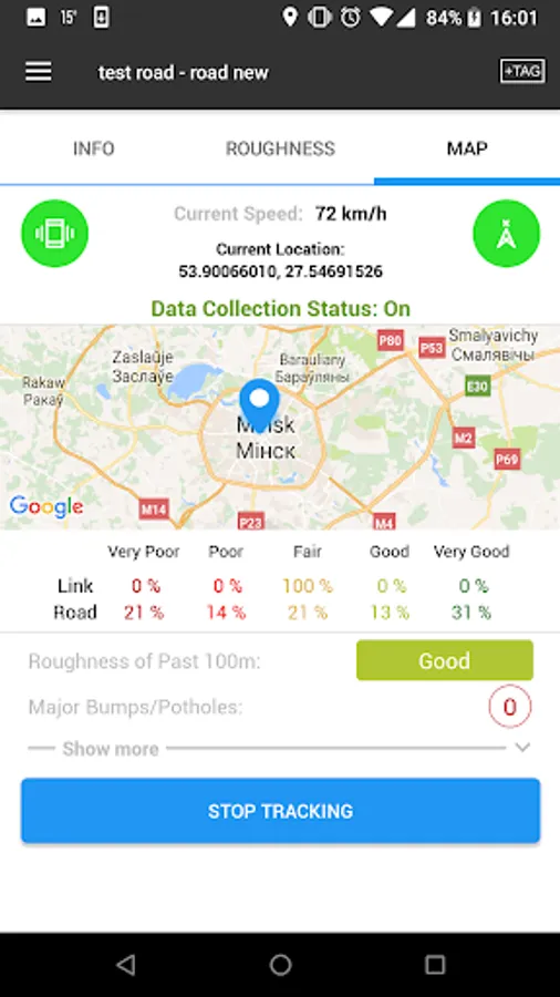 Road Lab Pro is designed as a data collection tool for engineer by the World Bank in collaboration with Beldor Center, Softteco and Progress Analytics LLC. (http://progressana.com). With accelerometers on your smartphones, this app evaluates road conditions, map road networks, detects major road bumps, and reports road safety hazards. You can even upload a picture of potholes, black spots, or road accidents, etc with a simple tag. The app runs on all Android devices, such as Android smartphones or tablets. Please click the link below to download the app. No data plan is required for running this app. All data collected can be emailed to yourself or uploaded to your own Dropbox account when wifi is available. To use the app, the mobile device has to be placed on a stable surface in your vehicle, preferably mounted vertically and tightly to the vehicle windshield.