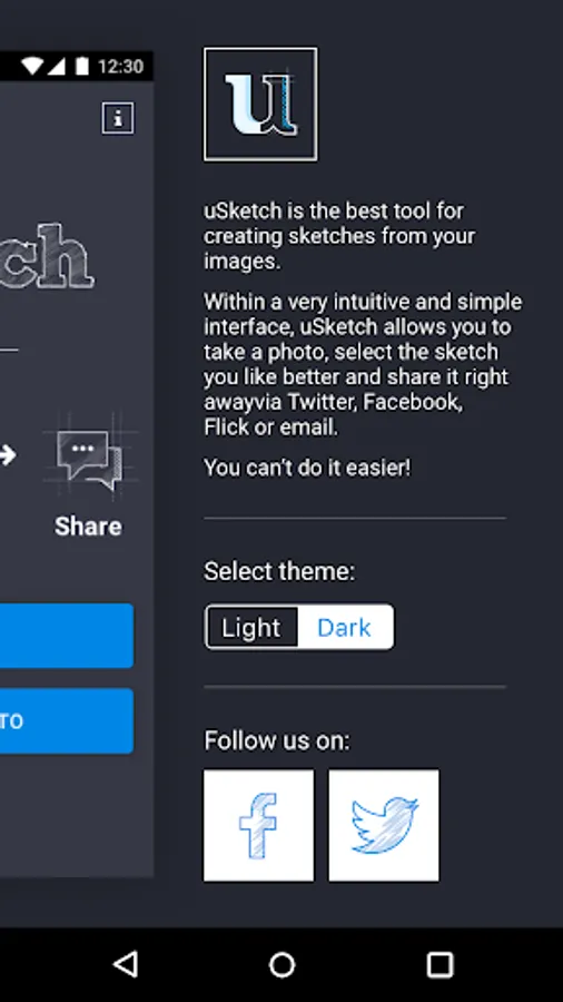 Within a very intuitive and simple interface, uSketch allows you to take a photo, select the sketch you like better and share it right away via Twitter, Facebook, Flickr or email.