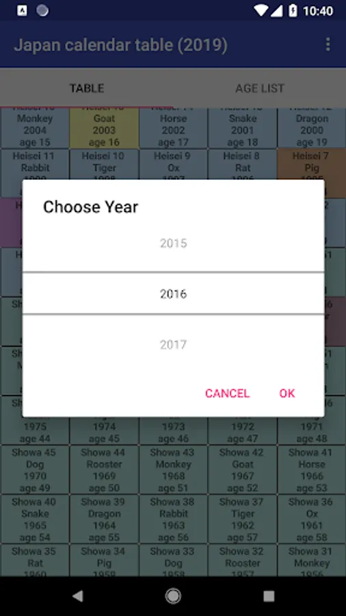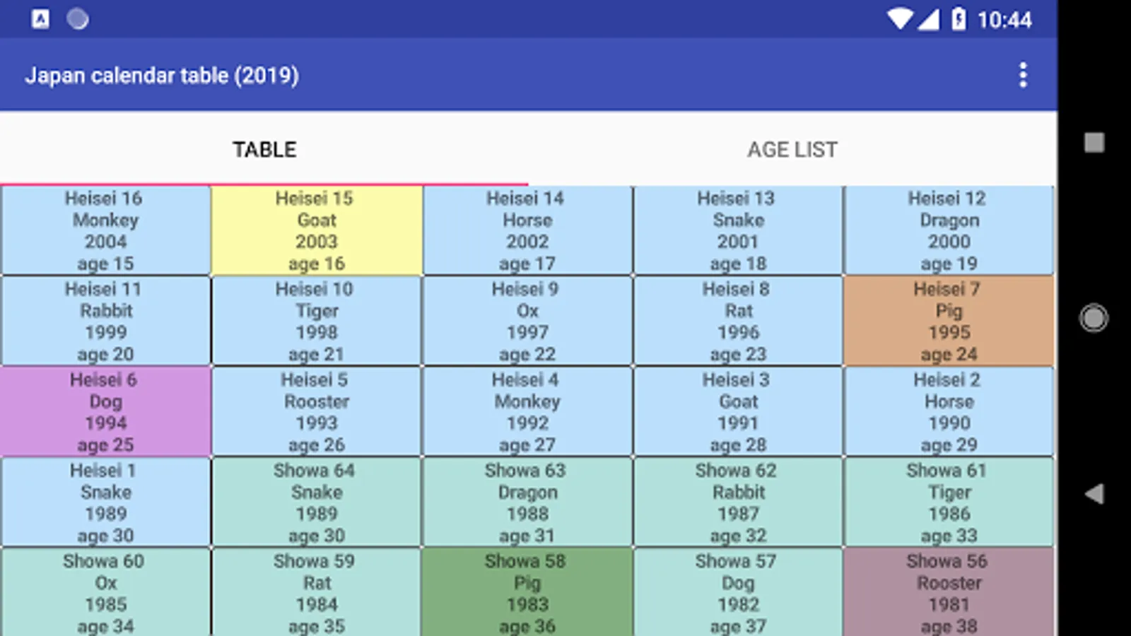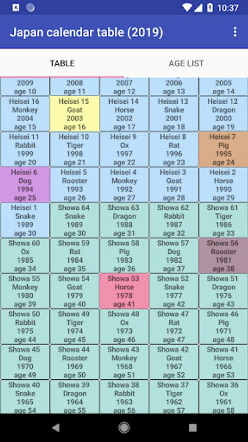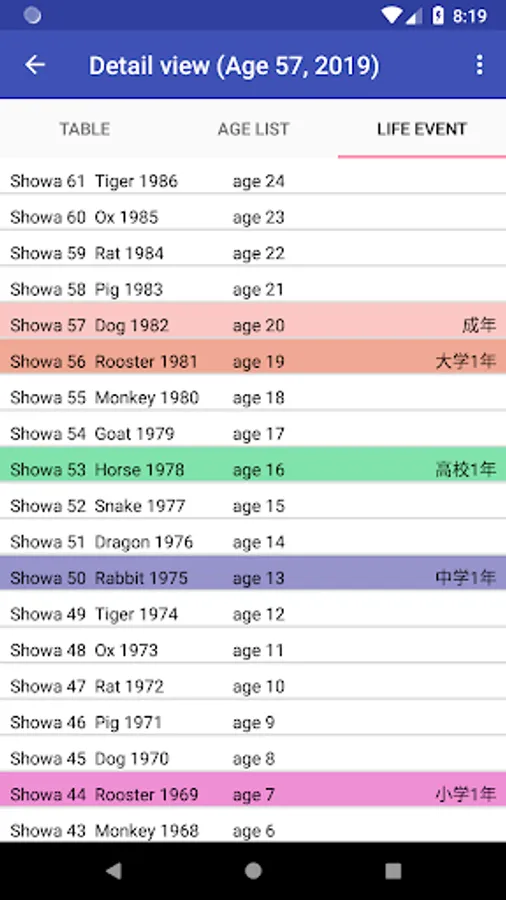 Touching any year will show the ages counting from the year to the birth year (age 0). For instance if you touch your birth year, you can check the year you reached the age of 20. From v2.1 the app shows life events such as enrollment into school, celebration of specific ages (The event is indigenous to Japan; event name is showed in Japanese).