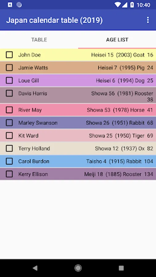 The table also contains Earthly Branches info for every year. Earthly Branches (Eto) is kind of the zodiac in Europe. Each animal represents every year. Most Japanese know his/her animal at the birth year. Talking about the animal at birth year can be a good topic for Japanese (no guarantee, though). Age field is the age so far this year.