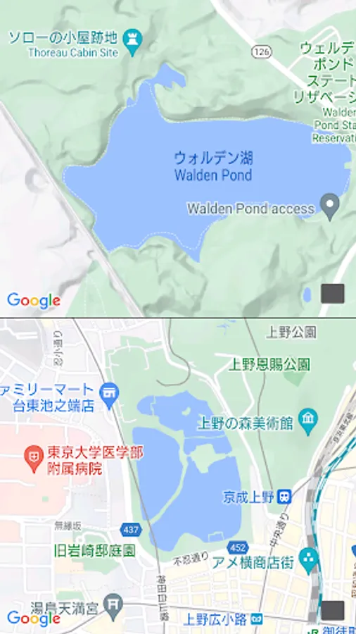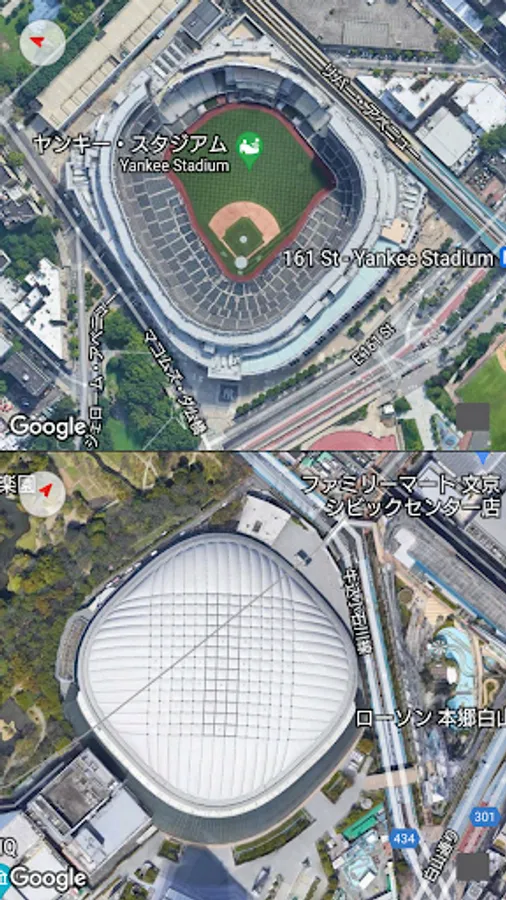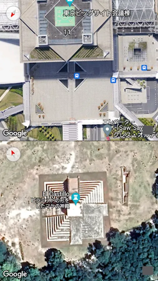 The app displays two GoogleMaps™ on a single screen. The map is scaled by its latitude; you can compare islands/buildings each other with correct scale.