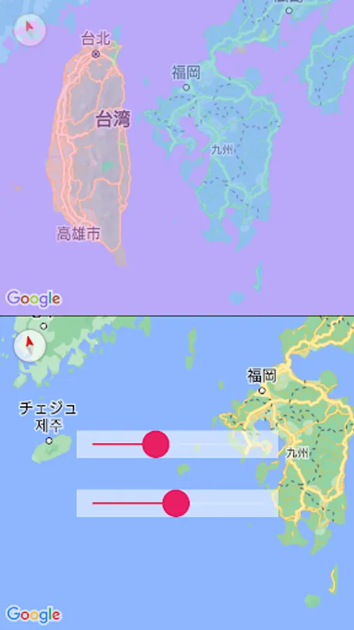 Touching Google™ icon at left-bottom switches map type. You can switch the type to terrain, satellite-hybrid, satellite, and normal. Long-tapping the icon will overlap the current map to the other. With two spinners, you can change Hue and Opacity of the overlayed map. Enjoy!