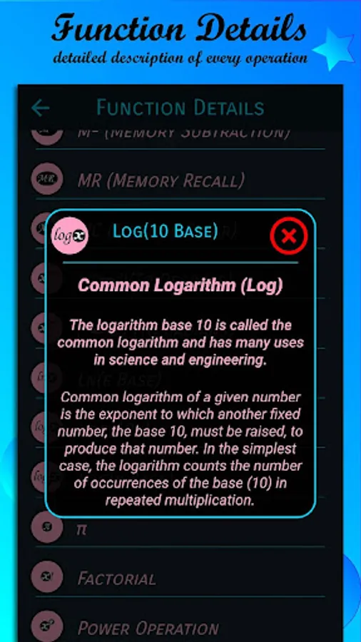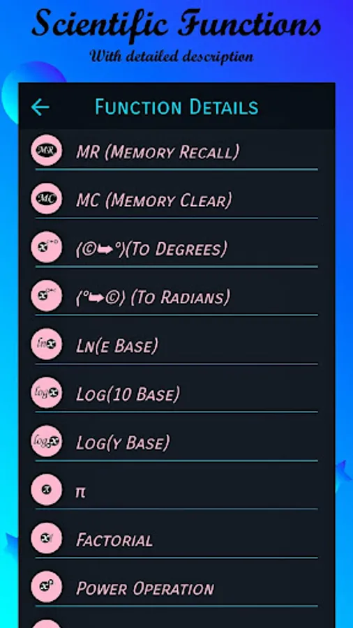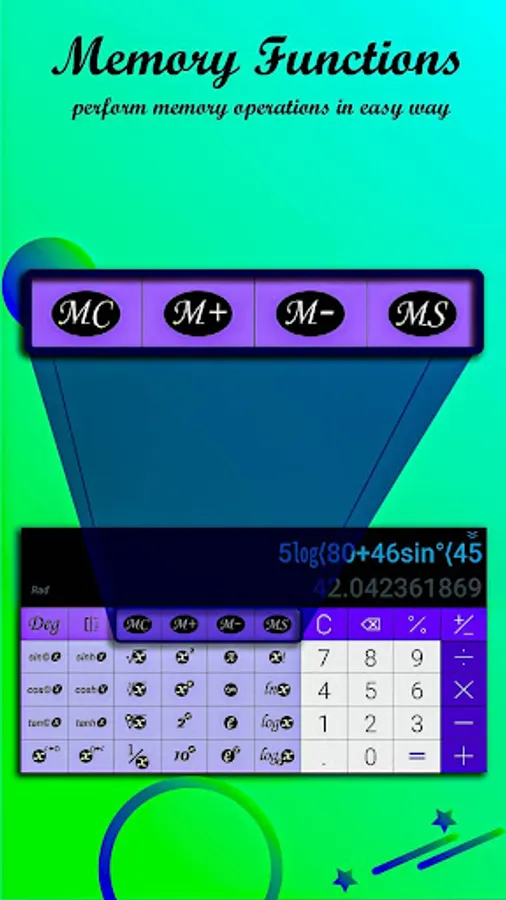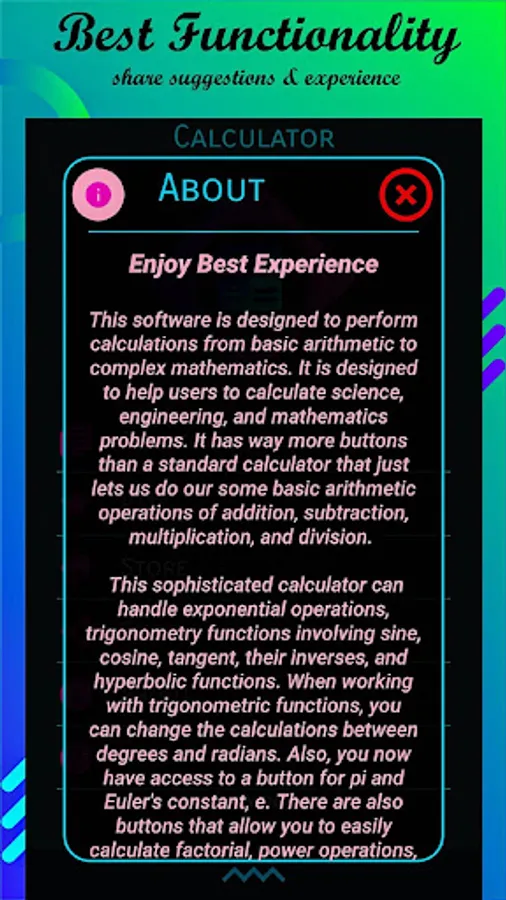 It lets user to performs all factorial, power, sin, cos, tan, cot, sec, cosec, sinh, cosh, tanh, coth, sech, cosech, square, cube, square root, cube root, pi, ln, log, log (y base), percentage & many arithmetic or mathematical operations on numbers. Apart from basic calculators it is more sophiscated calculator which can handle exponantial operations trignometric functions, hyperbolic functions, roots and logarithms.