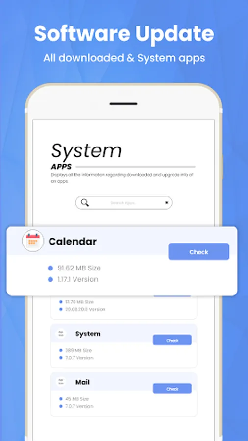 Update Software latest app works as software update check app for your system and applications by providing all the details of downloaded apps including application size, current application version, and application updates. It checks for updates and takes user to play store update screen to let them update apps. This software updater application keeps all your apps and system software updated, does auto update check and lets you enjoy the latest android version of all applications present on your android device.