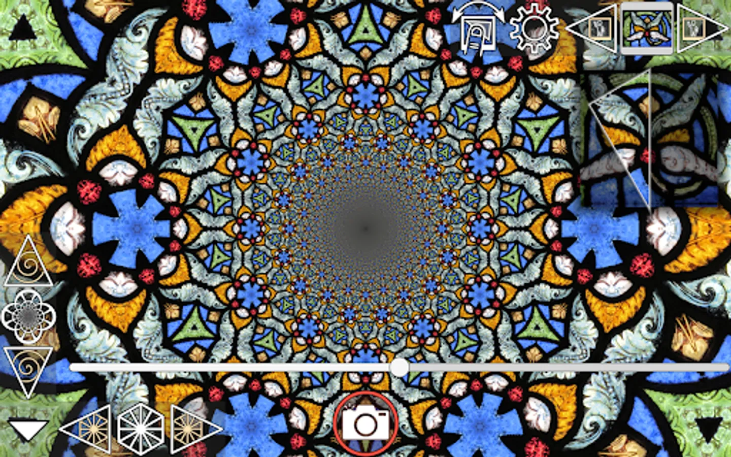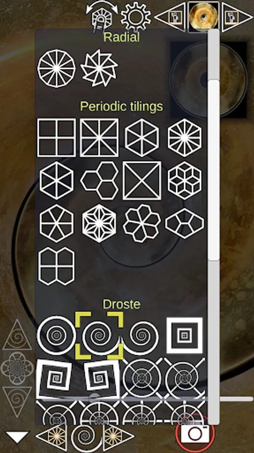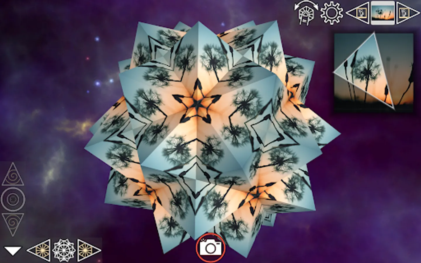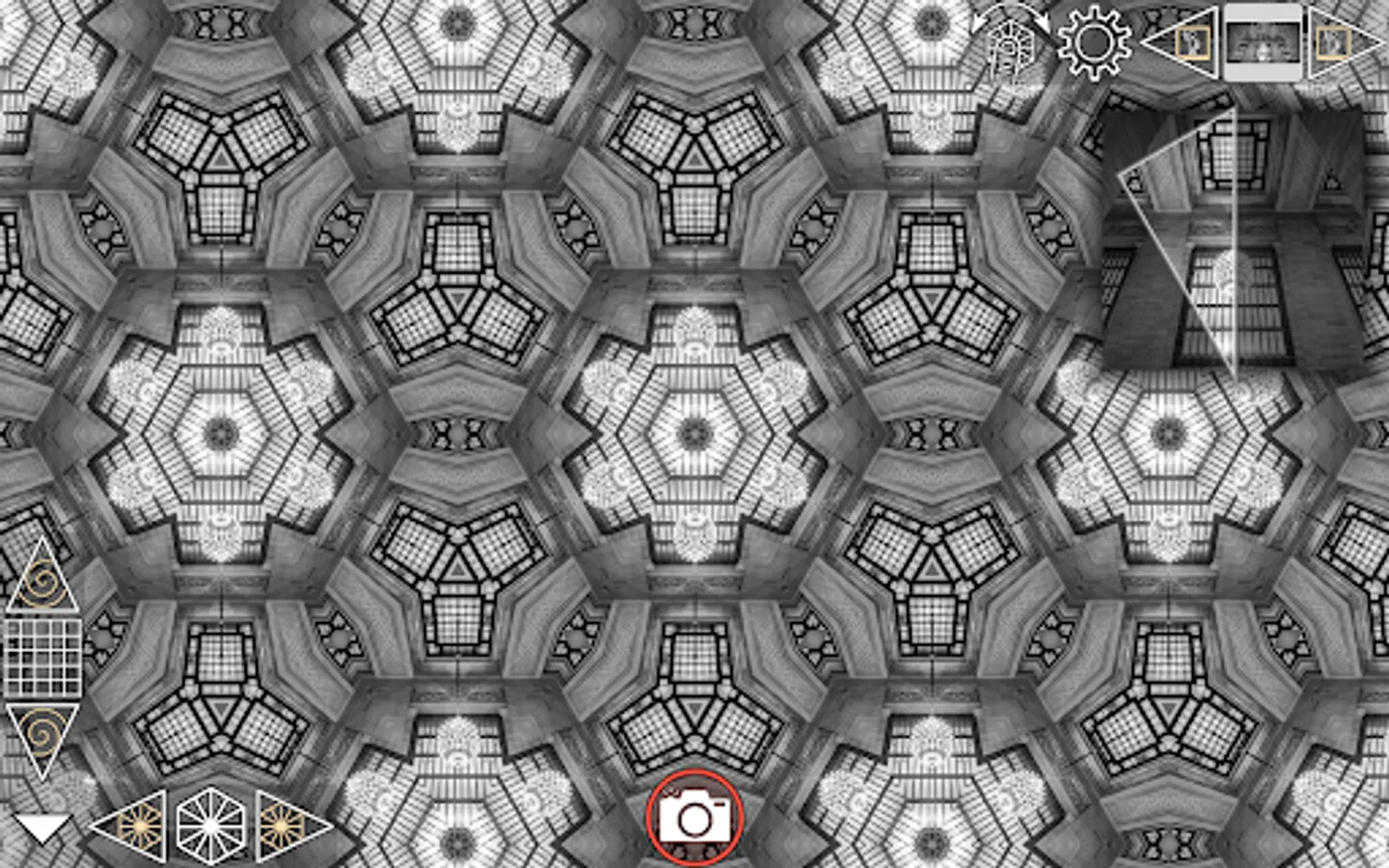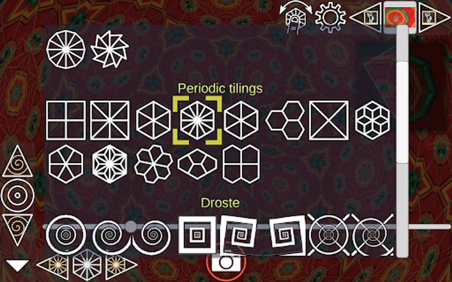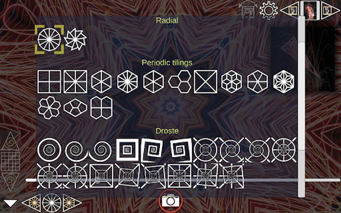 • Choose from dozens of kaleidoscopic patterns. Radial, periodic, Droste, 3D and more.
