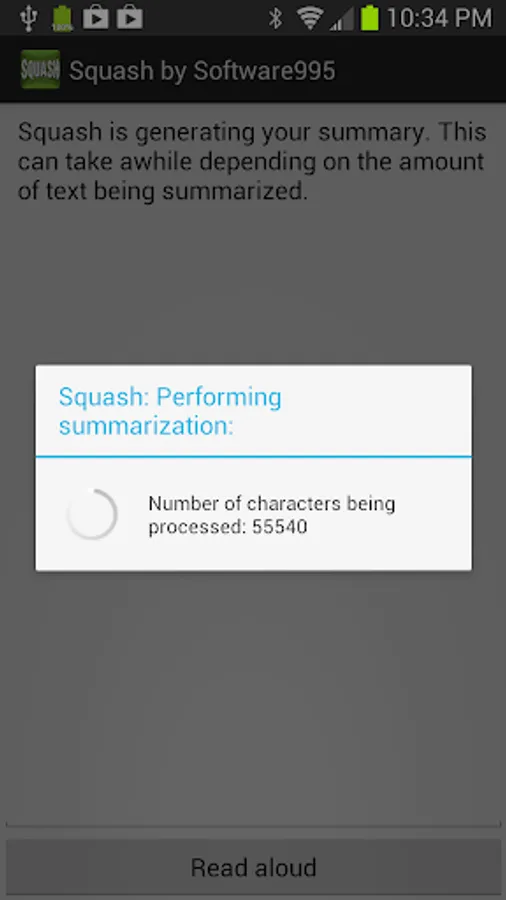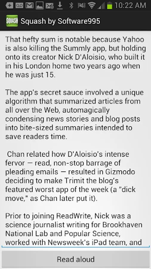 Lengthy texts are difficult to read on smart phones. Content is often formatted for a large screen. Smartphone users must perform a combination of tedious zoom and scroll operations to navigate the text. Advertisements interrupt the text flow. Squash is today's solution. It makes it possible for the smartphone user to quickly digest key concepts in content that was designed to be viewed on a larger screen. Squash presents a synopsis that is short, easy to read, and formatted specifically for phones and tablets. It can even read the summary aloud.