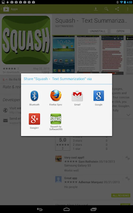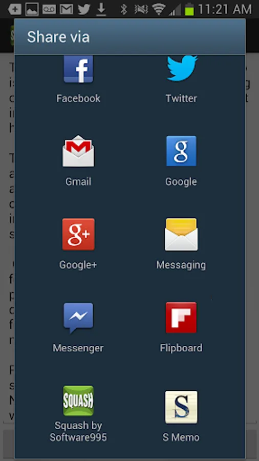 - summarizes text from Android’s “Share With” feature. For example, when text is selected on a web page in the Internet app, a toolbox will display at the top of the window. Pressing the right most icon of the toolbox will open Android’s “Share With” menu. If Squash is selected, Squash will launch with a summary of the selected text.