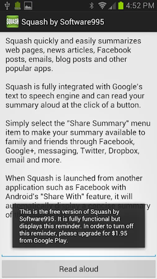 Squash takes full advantage of Android's "Share With" feature and integrates well with today's most popular Android apps. Simply select the "Share Summary" menu item to make your summary available through social networking apps, messaging, email and more. When Squash is launched from another application such as Facebook with Android's "Share With" feature, it will automatically display a concise summary of the shared text. If you need to summarize from an app that does not support Android's "Share With" feature, just copy the text to the clipboard and open Squash. Squash will automatically present you with a four sentence abstract of the clipboard's contents. Integration with Android’s sharing features makes Squash a perfect complement to Google News, the Nook app, World Newspapers, Flipboard, Reddit, Feedly, Pulse news and Firefox.