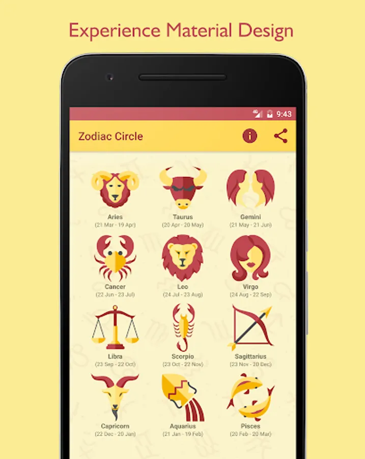 Experience Daily Horoscope with Minimal Material Designed Zodiac App. Zodiac Circle provides great Minimal User Interface for better browsing and reading Horoscope. We designed this app to provide short and relevant information of Zodiac sign you choose.