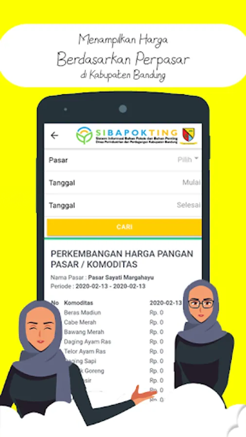 Information on prices of basic goods and important goods displayed is applicable in markets in the Regency of Bandung. Prices are updated every day and explained with information of rising or falling prices that occur.
