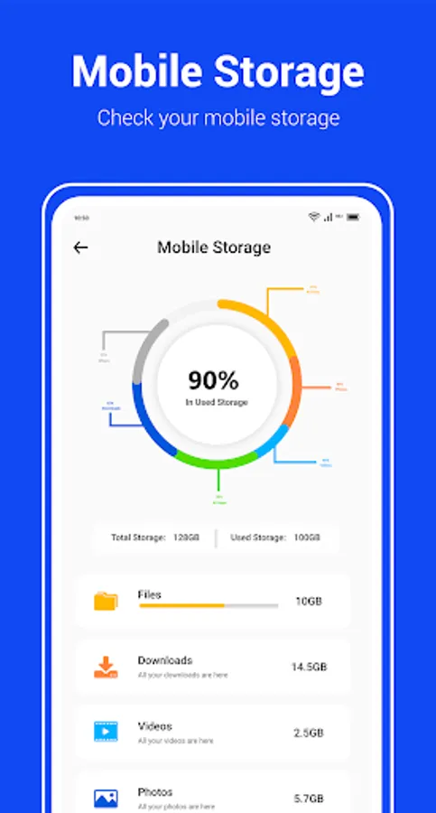Mobile storage feature shows you how much space is used by Photos, Videos, Audio, Documents, Apps, and APK files separately.