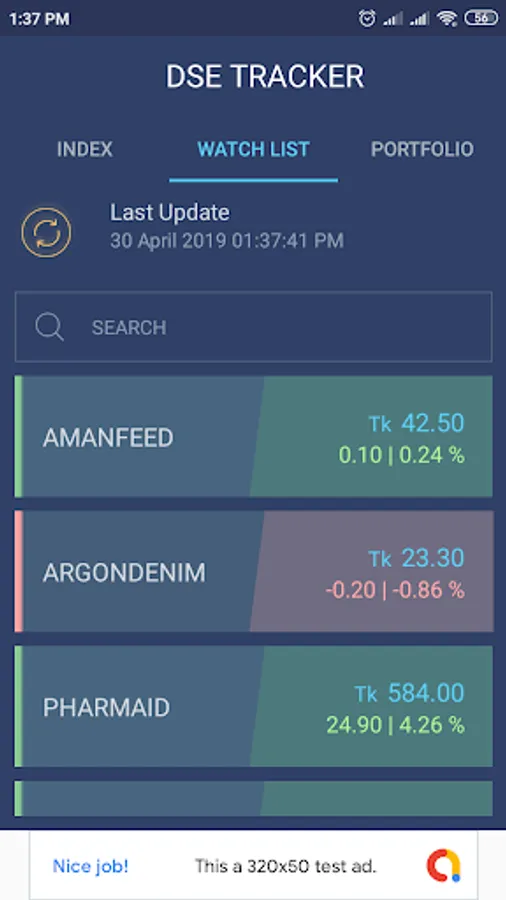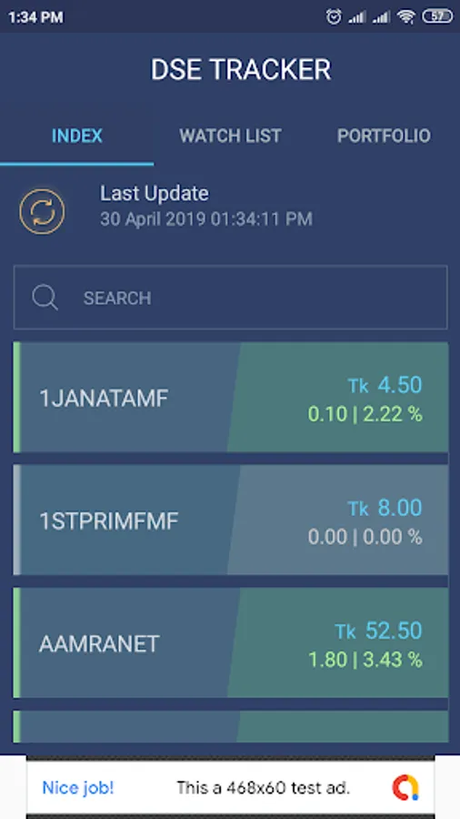 DSETracker allows users to get real time price of stock/shares from Dhaka Stock Exchange (DSE). Users can also maintain their Stock Portfolio in DSETracker. Press the Refresh button any time to get the latest price from DSE server and recalculate portfolio total value, loss/gain etc.